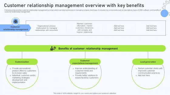 Following slide provides customer relationship management summary which can help businesses in managing company client base. It includes key components such as descriptions, types of CRM software, and benefits of customer relationship management. Boost your pitch with our creative Relationship Management Automation Software Customer Relationship Management. Deliver an awe-inspiring pitch that will mesmerize everyone. Using these presentation templates you will surely catch everyones attention. You can browse the ppts collection on our website. We have researchers who are experts at creating the right content for the templates. So you do not have to invest time in any additional work. Just grab the template now and use them. Following slide provides customer relationship management summary which can help businesses in managing company client base. It includes key components such as descriptions, types of CRM software, and benefits of customer relationship management.