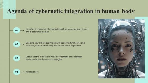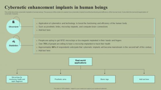 With well-researched insights and carefully-constructed design, this Cybernetic Integration In Human Body Ppt Powerpoint Presentation Complete Deck With Slides is all that you need for your next business meeting with clients and win them over. Add your data to graphs, charts, and tables that are already ready to display it with stunning visuals and help your audience recall your work. With this PPT Complete Deck, you will be able to display your knowledge of the subject as well as your skills as a communicator. Share your ideas and make an impact on the audience with this PowerPoint Layout and ensure that you are known as a presentation professional. Download this PPT Template Bundle to create the most interesting presentation anyone has ever seen. Our Cybernetic Integration In Human Body Ppt Powerpoint Presentation Complete Deck With Slides are topically designed to provide an attractive backdrop to any subject. Use them to look like a presentation pro.
