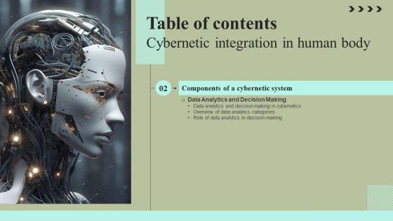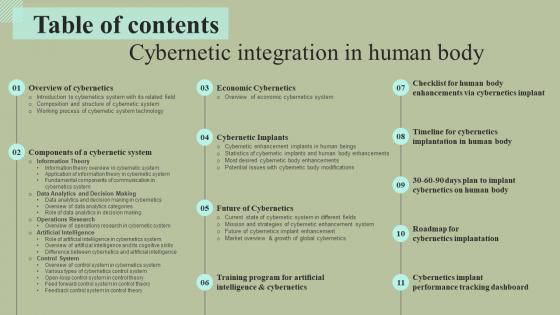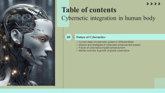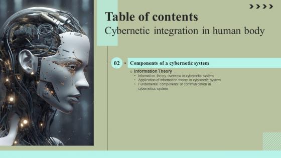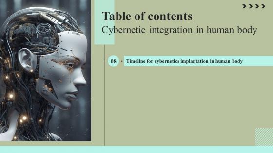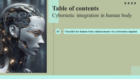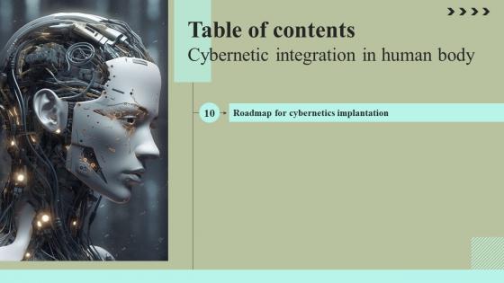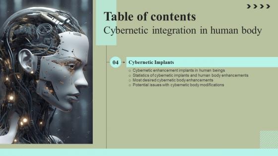 Formulating a presentation can take up a lot of effort and time, so the content and message should always be the primary focus. The visuals of the PowerPoint can enhance the presenters message, so our Table Of Contents Cybernetic Integration In Human Body Formats Pdf was created to help save time. Instead of worrying about the design, the presenter can concentrate on the message while our designers work on creating the ideal templates for whatever situation is needed. Slidegeeks has experts for everything from amazing designs to valuable content, we have put everything into Table Of Contents Cybernetic Integration In Human Body Formats Pdf Our Table Of Contents Cybernetic Integration In Human Body Formats Pdf are topically designed to provide an attractive backdrop to any subject. Use them to look like a presentation pro.