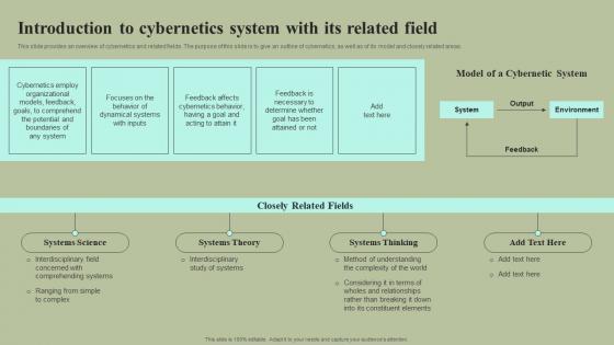This slide provides an overview of cybernetics and related fields. The purpose of this slide is to give an outline of cybernetics, as well as of its model and closely related areas. Want to ace your presentation in front of a live audience Our Introduction To Cybernetics System With Its Related Field Cybernetic Integration Diagrams Pdf can help you do that by engaging all the users towards you. Slidegeeks experts have put their efforts and expertise into creating these impeccable powerpoint presentations so that you can communicate your ideas clearly. Moreover, all the templates are customizable, and easy-to-edit and downloadable. Use these for both personal and commercial use. This slide provides an overview of cybernetics and related fields. The purpose of this slide is to give an outline of cybernetics, as well as of its model and closely related areas.