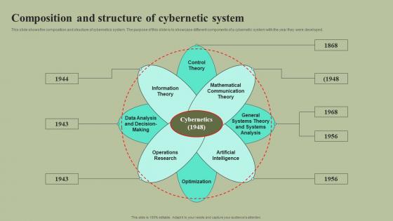 This slide shows the composition and structure of cybernetics system. The purpose of this slide is to showcase different components of a cybernetic system with the year they were developed. Are you searching for a Composition And Structure Of Cybernetic System Cybernetic Integration Inspiration Pdf that is uncluttered, straightforward, and original It is easy to edit, and you can change the colors to suit your personal or business branding. For a presentation that expresses how much effort you have put in, this template is ideal With all of its features, including tables, diagrams, statistics, and lists, it is perfect for a business plan presentation. Make your ideas more appealing with these professional slides. Download Composition And Structure Of Cybernetic System Cybernetic Integration Inspiration Pdf from Slidegeeks today. This slide shows the composition and structure of cybernetics system. The purpose of this slide is to showcase different components of a cybernetic system with the year they were developed.