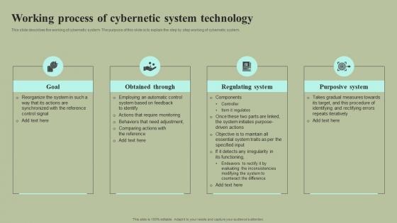 This slide describes the working of cybernetic system. The purpose of this slide is to explain the step by step working of cybernetic system. Welcome to our selection of the Working Process Of Cybernetic System Technology Cybernetic Integration Demonstration Pdf These are designed to help you showcase your creativity and bring your sphere to life. Planning and Innovation are essential for any business that is just starting out. This collection contains the designs that you need for your everyday presentations. All of our PowerPoints are 100 percent editable, so you can customize them to suit your needs. This multi-purpose template can be used in various situations. Grab these presentation templates today. This slide describes the working of cybernetic system. The purpose of this slide is to explain the step by step working of cybernetic system.