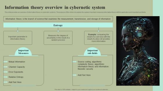 This slide provides an overview of information theory in cybernetic systems. The purpose of this slide is to explain the explain Important measures information theory with its application and important sub fields. Slidegeeks is one of the best resources for PowerPoint templates. You can download easily and regulate Information Theory Overview In Cybernetic System Cybernetic Integration Inspiration Pdf for your personal presentations from our wonderful collection. A few clicks is all it takes to discover and get the most relevant and appropriate templates. Use our Templates to add a unique zing and appeal to your presentation and meetings. All the slides are easy to edit and you can use them even for advertisement purposes. This slide provides an overview of information theory in cybernetic systems. The purpose of this slide is to explain the explain Important measures information theory with its application and important sub fields.
