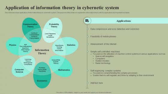This slide describes application of information theory in cybernetic system. The purpose of this slide is to explain the information theory with its application and important sub fields. The best PPT templates are a great way to save time, energy, and resources. Slidegeeks have 100 percent editable powerpoint slides making them incredibly versatile. With these quality presentation templates, you can create a captivating and memorable presentation by combining visually appealing slides and effectively communicating your message. Download Application Of Information Theory In Cybernetic System Cybernetic Integration Clipart Pdf from Slidegeeks and deliver a wonderful presentation. This slide describes application of information theory in cybernetic system. The purpose of this slide is to explain the information theory with its application and important sub fields.