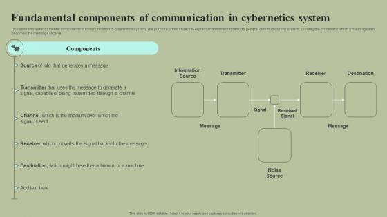 This slide shows fundamental components of communication in cybernetics system. The purpose of this slide is to explain shannons diagram of a generalcommunications system, showing the process by which a message sent becomes the message receive. Find a pre-designed and impeccable Fundamental Components Of Communication In Cybernetics System Cybernetic Integration Formats Pdf The templates can ace your presentation without additional effort. You can download these easy-to-edit presentation templates to make your presentation stand out from others. So, what are you waiting for Download the template from Slidegeeks today and give a unique touch to your presentation. This slide shows fundamental components of communication in cybernetics system. The purpose of this slide is to explain shannons diagram of a generalcommunications system, showing the process by which a message sent becomes the message receive.