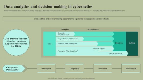 This slide tells data analytics and decision making. The purpose of this slide is to explain what is data analytics with its four categories. It also gives a description of descriptive and diagnostic data analysis. Here you can discover an assortment of the finest PowerPoint and Google Slides templates. With these templates, you can create presentations for a variety of purposes while simultaneously providing your audience with an eye-catching visual experience. Download Data Analytics And Decision Making In Cybernetics Cybernetic Integration Inspiration Pdf to deliver an impeccable presentation. These templates will make your job of preparing presentations much quicker, yet still, maintain a high level of quality. Slidegeeks has experienced researchers who prepare these templates and write high-quality content for you. Later on, you can personalize the content by editing the Data Analytics And Decision Making In Cybernetics Cybernetic Integration Inspiration Pdf This slide tells data analytics and decision making. The purpose of this slide is to explain what is data analytics with its four categories. It also gives a description of descriptive and diagnostic data analysis.