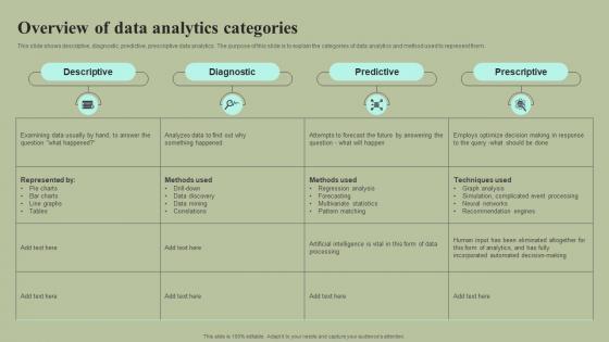 This slide shows descriptive, diagnostic, predictive, prescriptive data analytics. The purpose of this slide is to explain the categories of data analytics and method used to represent them. Do you have an important presentation coming up Are you looking for something that will make your presentation stand out from the rest Look no further than Overview Of Data Analytics Categories Cybernetic Integration Diagrams Pdf With our professional designs, you can trust that your presentation will pop and make delivering it a smooth process. And with Slidegeeks, you can trust that your presentation will be unique and memorable. So why wait Grab Overview Of Data Analytics Categories Cybernetic Integration Diagrams Pdf today and make your presentation stand out from the rest. This slide shows descriptive, diagnostic, predictive, prescriptive data analytics. The purpose of this slide is to explain the categories of data analytics and method used to represent them.