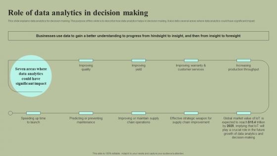 This slide explains data analytics for decision making. The purpose of this slide is to describe how data analytics helps in decision making. It also tells several areas where data analytics could have significant impact. Crafting an eye-catching presentation has never been more straightforward. Let your presentation shine with this tasteful yet straightforward Role Of Data Analytics In Decision Making Cybernetic Integration Designs Pdf template. It offers a minimalistic and classy look that is great for making a statement. The colors have been employed intelligently to add a bit of playfulness while still remaining professional. Construct the ideal Role Of Data Analytics In Decision Making Cybernetic Integration Designs Pdf that effortlessly grabs the attention of your audience. Begin now and be certain to wow your customers. This slide explains data analytics for decision making. The purpose of this slide is to describe how data analytics helps in decision making. It also tells several areas where data analytics could have significant impact.