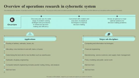 This slide gives an overview of operation research in cybernetic system. The purpose of this slide is to define operation research, its applications, and the different sub disciplines within operations research. Find highly impressive Overview Of Operations Research In Cybernetic System Cybernetic Integration Download Pdf on Slidegeeks to deliver a meaningful presentation. You can save an ample amount of time using these presentation templates. No need to worry to prepare everything from scratch because Slidegeeks experts have already done a huge research and work for you. You need to download Overview Of Operations Research In Cybernetic System Cybernetic Integration Download Pdf for your upcoming presentation. All the presentation templates are 100 percent editable and you can change the color and personalize the content accordingly. Download now. This slide gives an overview of operation research in cybernetic system. The purpose of this slide is to define operation research, its applications, and the different sub disciplines within operations research.