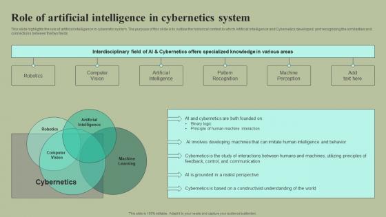 This slide highlights the role of artificial intelligence in cybernetic system. The purpose of this slide is to outline the historical context in which Artificial Intelligence and Cybernetics developed, and recognizing the similarities and connections between the two fields. Are you in need of a template that can accommodate all of your creative concepts This one is crafted professionally and can be altered to fit any style. Use it with Google Slides or PowerPoint. Include striking photographs, symbols, depictions, and other visuals. Fill, move around, or remove text boxes as desired. Test out color palettes and font mixtures. Edit and save your work, or work with colleagues. Download Role Of Artificial Intelligence In Cybernetics System Cybernetic Integration Professional Pdf and observe how to make your presentation outstanding. Give an impeccable presentation to your group and make your presentation unforgettable. This slide highlights the role of artificial intelligence in cybernetic system. The purpose of this slide is to outline the historical context in which Artificial Intelligence and Cybernetics developed, and recognizing the similarities and connections between the two fields.