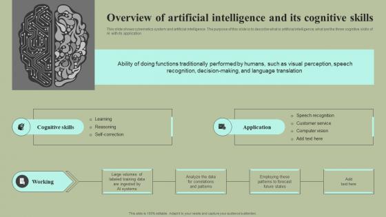 This slide shows cybernetics system and artificial intelligence. The purpose of this slide is to describe what is artificial intelligence, what are the three cognitive skills of AI with its application. Present like a pro with Overview Of Artificial Intelligence And Its Cognitive Skills Cybernetic Integration Summary Pdf Create beautiful presentations together with your team, using our easy-to-use presentation slides. Share your ideas in real-time and make changes on the fly by downloading our templates. So whether you are in the office, on the go, or in a remote location, you can stay in sync with your team and present your ideas with confidence. With Slidegeeks presentation got a whole lot easier. Grab these presentations today. This slide shows cybernetics system and artificial intelligence. The purpose of this slide is to describe what is artificial intelligence, what are the three cognitive skills of AI with its application.