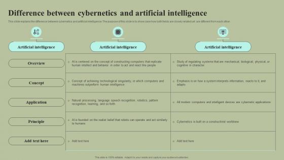 This slide explains the difference between cybernetics and artificial intelligence. The purpose of this slide is to show case how both fields are closely related yet are different from each other. This Difference Between Cybernetics And Artificial Intelligence Cybernetic Integration Elements Pdf from Slidegeeks makes it easy to present information on your topic with precision. It provides customization options, so you can make changes to the colors, design, graphics, or any other component to create a unique layout. It is also available for immediate download, so you can begin using it right away. Slidegeeks has done good research to ensure that you have everything you need to make your presentation stand out. Make a name out there for a brilliant performance. This slide explains the difference between cybernetics and artificial intelligence. The purpose of this slide is to show case how both fields are closely related yet are different from each other.