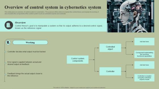 This slide gives an overview of control system in cybernetics. The purpose of this slide is to explain the control theory and explain its working. It also includes the components of the control system such as controlled objects and controller. Slidegeeks is here to make your presentations a breeze with Overview Of Control System In Cybernetics System Cybernetic Integration Slides Pdf With our easy-to-use and customizable templates, you can focus on delivering your ideas rather than worrying about formatting. With a variety of designs to choose from, you are sure to find one that suits your needs. And with animations and unique photos, illustrations, and fonts, you can make your presentation pop. So whether you are giving a sales pitch or presenting to the board, make sure to check out Slidegeeks first. This slide gives an overview of control system in cybernetics. The purpose of this slide is to explain the control theory and explain its working. It also includes the components of the control system such as controlled objects and controller.