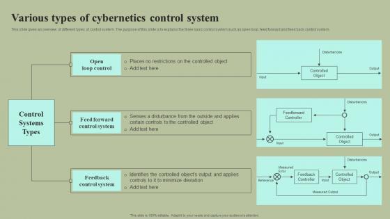 This slide gives an overview of different types of control system. The purpose of this slide is to explains the three basic control system such as open loop, feed forward and feed back control system. This Various Types Of Cybernetics Control System Cybernetic Integration Sample Pdf is perfect for any presentation, be it in front of clients or colleagues. It is a versatile and stylish solution for organizing your meetings. The Various Types Of Cybernetics Control System Cybernetic Integration Sample Pdf features a modern design for your presentation meetings. The adjustable and customizable slides provide unlimited possibilities for acing up your presentation. Slidegeeks has done all the homework before launching the product for you. So, do not wait, grab the presentation templates today This slide gives an overview of different types of control system. The purpose of this slide is to explains the three basic control system such as open loop, feed forward and feed back control system.