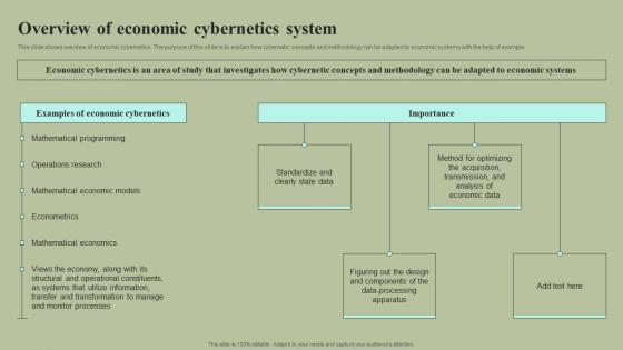 This slide shows overview of economic cybernetics. The purpose of this slide is to explain how cybernetic concepts and methodology can be adapted to economic systems with the help of example. Whether you have daily or monthly meetings, a brilliant presentation is necessary. Overview Of Economic Cybernetics System Cybernetic Integration Professional Pdf can be your best option for delivering a presentation. Represent everything in detail using Overview Of Economic Cybernetics System Cybernetic Integration Professional Pdf and make yourself stand out in meetings. The template is versatile and follows a structure that will cater to your requirements. All the templates prepared by Slidegeeks are easy to download and edit. Our research experts have taken care of the corporate themes as well. So, give it a try and see the results. This slide shows overview of economic cybernetics. The purpose of this slide is to explain how cybernetic concepts and methodology can be adapted to economic systems with the help of example.