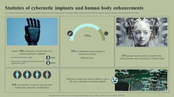 This slide describes future of cybernetic implants and human body enhancements. The purpose of this slide is to list the different reaction of people towards enhancement of human body. Make sure to capture your audiences attention in your business displays with our gratis customizable Statistics Of Cybernetic Implants And Human Body Enhancements Cybernetic Integration Ideas Pdf These are great for business strategies, office conferences, capital raising or task suggestions. If you desire to acquire more customers for your tech business and ensure they stay satisfied, create your own sales presentation with these plain slides. This slide describes future of cybernetic implants and human body enhancements. The purpose of this slide is to list the different reaction of people towards enhancement of human body.