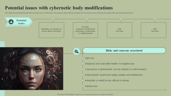This slide shows potential issues with cybernetic body modifications. The purpose of this slide is to explain the risk and concerns of people associated with cybernetic enhancement. If your project calls for a presentation, then Slidegeeks is your go-to partner because we have professionally designed, easy-to-edit templates that are perfect for any presentation. After downloading, you can easily edit Potential Issues With Cybernetic Body Modifications Cybernetic Integration Microsoft Pdf and make the changes accordingly. You can rearrange slides or fill them with different images. Check out all the handy templates This slide shows potential issues with cybernetic body modifications. The purpose of this slide is to explain the risk and concerns of people associated with cybernetic enhancement.