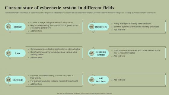 This slide shows the current state of cybernetic system. The purpose of this slide is to describe the use case or application of Cybernetic system in the field of biology, law, sociology, business, economic systems, etc. Retrieve professionally designed Current State Of Cybernetic System In Different Fields Cybernetic Integration Portrait Pdf to effectively convey your message and captivate your listeners. Save time by selecting pre-made slideshows that are appropriate for various topics, from business to educational purposes. These themes come in many different styles, from creative to corporate, and all of them are easily adjustable and can be edited quickly. Access them as PowerPoint templates or as Google Slides themes. You do not have to go on a hunt for the perfect presentation because Slidegeeks got you covered from everywhere. This slide shows the current state of cybernetic system. The purpose of this slide is to describe the use case or application of Cybernetic system in the field of biology, law, sociology, business, economic systems, etc.