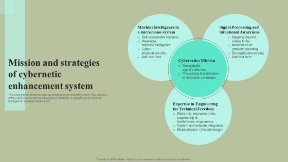 This slide demonstrates mission and strategies of cybernetic system. The purpose of this slide is to explain the strategies of cybernetic system towards machine intelligence, signal processing, etc. Do you have to make sure that everyone on your team knows about any specific topic I yes, then you should give Mission And Strategies Of Cybernetic Enhancement System Cybernetic Integration Guidelines Pdf a try. Our experts have put a lot of knowledge and effort into creating this impeccable Mission And Strategies Of Cybernetic Enhancement System Cybernetic Integration Guidelines Pdf You can use this template for your upcoming presentations, as the slides are perfect to represent even the tiniest detail. You can download these templates from the Slidegeeks website and these are easy to edit. So grab these today. This slide demonstrates mission and strategies of cybernetic system. The purpose of this slide is to explain the strategies of cybernetic system towards machine intelligence, signal processing, etc.