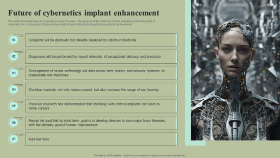 This slide shows the future of cybernetics in next 50 years . The purpose of this slide is to list the potential growth in the field of cybernetics in coming years. Its also shines a light on upcoming technology that are going to be developed. Find a pre-designed and impeccable Future Of Cybernetics Implant Enhancement Cybernetic Integration Ideas Pdf The templates can ace your presentation without additional effort. You can download these easy-to-edit presentation templates to make your presentation stand out from others. So, what are you waiting for Download the template from Slidegeeks today and give a unique touch to your presentation. This slide shows the future of cybernetics in next 50 years . The purpose of this slide is to list the potential growth in the field of cybernetics in coming years. Its also shines a light on upcoming technology that are going to be developed.