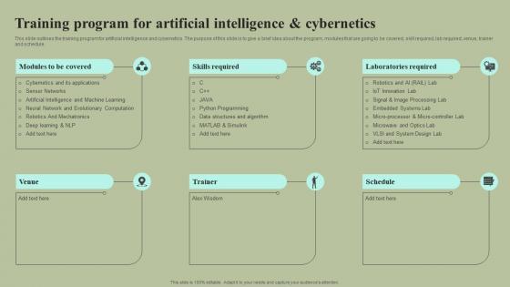 This slide outlines the training program for artificial intelligence and cybernetics. The purpose of this slide is to give a brief idea about the program, modules that are going to be covered, skill required, lab required, venue, trainer and schedule. This modern and well-arranged Training Program For Artificial Intelligence And Cybernetics Cybernetic Integration Clipart Pdf provides lots of creative possibilities. It is very simple to customize and edit with the Powerpoint Software. Just drag and drop your pictures into the shapes. All facets of this template can be edited with Powerpoint no extra software is necessary. Add your own material, put your images in the places assigned for them, adjust the colors, and then you can show your slides to the world, with an animated slide included. This slide outlines the training program for artificial intelligence and cybernetics. The purpose of this slide is to give a brief idea about the program, modules that are going to be covered, skill required, lab required, venue, trainer and schedule.