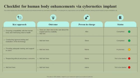 This slide explains the checklist for human body enhancements via cybernetics implantation, including the key approaches such as identify, analysis, finding correct implant, proper installation, etc. The Checklist For Human Body Enhancements Via Cybernetics Implant Cybernetic Integration Inspiration Pdf is a compilation of the most recent design trends as a series of slides. It is suitable for any subject or industry presentation, containing attractive visuals and photo spots for businesses to clearly express their messages. This template contains a variety of slides for the user to input data, such as structures to contrast two elements, bullet points, and slides for written information. Slidegeeks is prepared to create an impression. This slide explains the checklist for human body enhancements via cybernetics implantation, including the key approaches such as identify, analysis, finding correct implant, proper installation, etc.