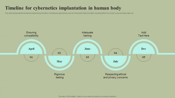 This slide represents the timeline to Implement cybernetics, including key approaches such as checking for data mismatch, visualizing the to-be model, using necessary data, etc. Coming up with a presentation necessitates that the majority of the effort goes into the content and the message you intend to convey. The visuals of a PowerPoint presentation can only be effective if it supplements and supports the story that is being told. Keeping this in mind our experts created Timeline For Cybernetics Implantation In Human Body Cybernetic Integration Portrait Pdf to reduce the time that goes into designing the presentation. This way, you can concentrate on the message while our designers take care of providing you with the right template for the situation. This slide represents the timeline to Implement cybernetics, including key approaches such as checking for data mismatch, visualizing the to-be model, using necessary data, etc.