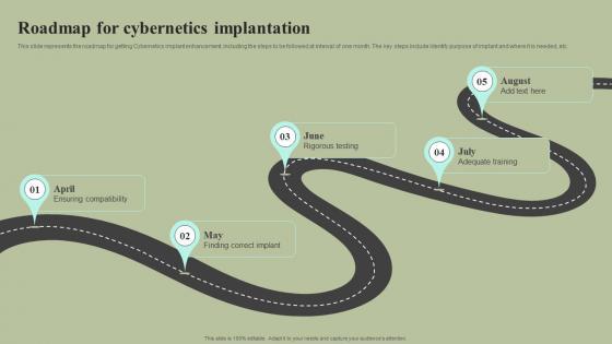 This slide represents the roadmap for getting Cybernetics implant enhancement, including the steps to be followed at interval of one month. The key steps include Identify purpose of implant and where it is needed, etc. If you are looking for a format to display your unique thoughts, then the professionally designed Roadmap For Cybernetics Implantation Cybernetic Integration Introduction Pdf is the one for you. You can use it as a Google Slides template or a PowerPoint template. Incorporate impressive visuals, symbols, images, and other charts. Modify or reorganize the text boxes as you desire. Experiment with shade schemes and font pairings. Alter, share or cooperate with other people on your work. Download Roadmap For Cybernetics Implantation Cybernetic Integration Introduction Pdf and find out how to give a successful presentation. Present a perfect display to your team and make your presentation unforgettable. This slide represents the roadmap for getting Cybernetics implant enhancement, including the steps to be followed at interval of one month. The key steps include Identify purpose of implant and where it is needed, etc.