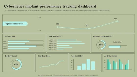This slide shows the Cybernetics implant performance tracking dashboard. The purpose of this slide is to represent the Information related to the status of Cybernetics implant graphically. Presenting this PowerPoint presentation, titled Cybernetics Implant Performance Tracking Dashboard Cybernetic Integration Icons Pdf with topics curated by our researchers after extensive research. This editable presentation is available for immediate download and provides attractive features when used. Download now and captivate your audience. Presenting this Cybernetics Implant Performance Tracking Dashboard Cybernetic Integration Icons Pdf Our researchers have carefully researched and created these slides with all aspects taken into consideration. This is a completely customizable Cybernetics Implant Performance Tracking Dashboard Cybernetic Integration Icons Pdf that is available for immediate downloading. Download now and make an impact on your audience. Highlight the attractive features available with our PPTs. This slide shows the Cybernetics implant performance tracking dashboard. The purpose of this slide is to represent the Information related to the status of Cybernetics implant graphically.