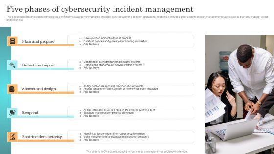This slide represents the stages of the process which aims towards minimizing the impact of cyber security incidents on operational functions. It includes cyber security incident management stages such as plan and prepare, detect and report etc. Do you have to make sure that everyone on your team knows about any specific topic I yes, then you should give Five Phases Of Cybersecurity Incident Management Topics PDF a try. Our experts have put a lot of knowledge and effort into creating this impeccable Five Phases Of Cybersecurity Incident Management Topics PDF. You can use this template for your upcoming presentations, as the slides are perfect to represent even the tiniest detail. You can download these templates from the Slidegeeks website and these are easy to edit. So grab these today.
