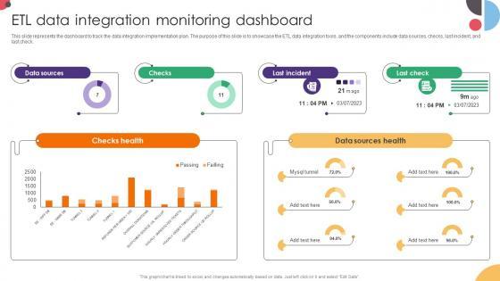 This slide represents the dashboard to track the data integration implementation plan. The purpose of this slide is to showcase the ETL data integration tools, and the components include data sources, checks, last incident, and last check. Are you searching for a ETL Data Integration Monitoring Dashboard Data Integration Strategies For Business that is uncluttered, straightforward, and original Its easy to edit, and you can change the colors to suit your personal or business branding. For a presentation that expresses how much effort you have put in, this template is ideal With all of its features, including tables, diagrams, statistics, and lists, its perfect for a business plan presentation. Make your ideas more appealing with these professional slides. Download ETL Data Integration Monitoring Dashboard Data Integration Strategies For Business from Slidegeeks today. This slide represents the dashboard to track the data integration implementation plan. The purpose of this slide is to showcase the ETL data integration tools, and the components include data sources, checks, last incident, and last check.