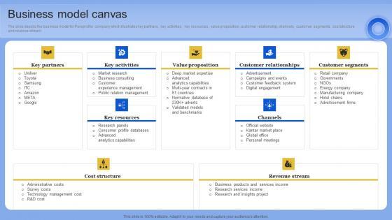 The slide depicts the business model for Pureprofile company which illustrates key partners, key activities, key resources, value proposition, customer relationship, channels, customer segments, cost structure and revenue stream. Slidegeeks is one of the best resources for PowerPoint templates. You can download easily and regulate Business Model Canvas Data Analytics Company Outline Demonstration PDF for your personal presentations from our wonderful collection. A few clicks is all it takes to discover and get the most relevant and appropriate templates. Use our Templates to add a unique zing and appeal to your presentation and meetings. All the slides are easy to edit and you can use them even for advertisement purposes. The slide depicts the business model for Pureprofile company which illustrates key partners, key activities, key resources, value proposition, customer relationship, channels, customer segments, cost structure and revenue stream.