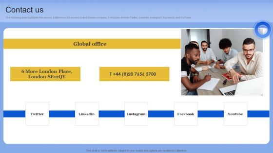 The following slide highlights the various platforms to follow and contact Kantar company. It includes links for Twitter, LinkedIn, Instagram, Facebook, and YouTube. Do you have to make sure that everyone on your team knows about any specific topic I yes, then you should give Contact Us Data Analytics Company Outline Sample PDF a try. Our experts have put a lot of knowledge and effort into creating this impeccable Contact Us Data Analytics Company Outline Sample PDF You can use this template for your upcoming presentations, as the slides are perfect to represent even the tiniest detail. You can download these templates from the Slidegeeks website and these are easy to edit. So grab these today The following slide highlights the various platforms to follow and contact Kantar company. It includes links for Twitter, LinkedIn, Instagram, Facebook, and YouTube