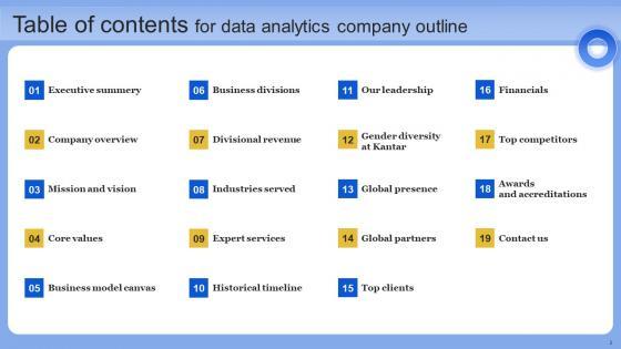Take your projects to the next level with our ultimate collection of Table Of Contents For Data Analytics Company Outline Formats PDF Slidegeeks has designed a range of layouts that are perfect for representing task or activity duration, keeping track of all your deadlines at a glance. Tailor these designs to your exact needs and give them a truly corporate look with your own brand colors they will make your projects stand out from the rest Our Table Of Contents For Data Analytics Company Outline Formats PDF are topically designed to provide an attractive backdrop to any subject. Use them to look like a presentation pro.