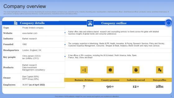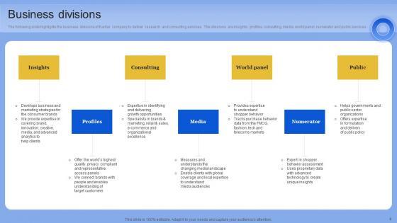 The following slide highlights the business divisions of Kantar company to deliver research and consulting services. The divisions are insights, profiles, consulting, media, world panel, numerator and public services. Create an editable Business Divisions Data Analytics Company Outline Professional PDF that communicates your idea and engages your audience. Whether you are presenting a business or an educational presentation, pre-designed presentation templates help save time. Business Divisions Data Analytics Company Outline Professional PDF is highly customizable and very easy to edit, covering many different styles from creative to business presentations. Slidegeeks has creative team members who have crafted amazing templates. So, go and get them without any delay. The following slide highlights the business divisions of Kantar company to deliver research and consulting services. The divisions are insights, profiles, consulting, media, world panel, numerator and public services