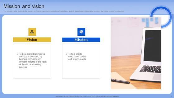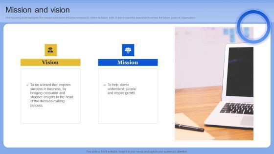 The following slide highlights the mission and vision of Kantar company to define its future path. It also shows the aspiration to convey the future goals of organization. Are you searching for a Mission And Vision Data Analytics Company Outline Icons PDF that is uncluttered, straightforward, and original Its easy to edit, and you can change the colors to suit your personal or business branding. For a presentation that expresses how much effort you have put in, this template is ideal With all of its features, including tables, diagrams, statistics, and lists, its perfect for a business plan presentation. Make your ideas more appealing with these professional slides. Download Mission And Vision Data Analytics Company Outline Icons PDF from Slidegeeks today. The following slide highlights the mission and vision of Kantar company to define its future path. It also shows the aspiration to convey the future goals of organization