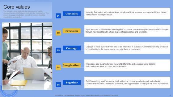 The following slide highlights the core values of kantar company to describe the work culture in the organization. The principle values included are curiosity, precision, courage, imagination and together. Get a simple yet stunning designed Core Values Data Analytics Company Outline Portrait PDF It is the best one to establish the tone in your meetings. It is an excellent way to make your presentations highly effective. So, download this PPT today from Slidegeeks and see the positive impacts. Our easy-to-edit Core Values Data Analytics Company Outline Portrait PDF can be your go-to option for all upcoming conferences and meetings. So, what are you waiting for Grab this template today. The following slide highlights the core values of kantar company to describe the work culture in the organization. The principle values included are curiosity, precision, courage, imagination and together