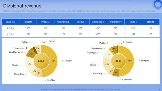 The following slide highlights the comparative revenue generated from multiple business divisions for 2020 and 2021. The divisions included are insights, profiles, consulting, media, world panel, numerator and public services From laying roadmaps to briefing everything in detail, our templates are perfect for you. You can set the stage with your presentation slides. All you have to do is download these easy-to-edit and customizable templates. Divisional Revenue Data Analytics Company Outline Pictures PDF will help you deliver an outstanding performance that everyone would remember and praise you for. Do download this presentation today. The following slide highlights the comparative revenue generated from multiple business divisions for 2020 and 2021. The divisions included are insights, profiles, consulting, media, world panel, numerator and public services