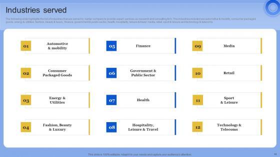 Introducing our well designed Icons Slide Data Analytics Company Outline Sample PDF set of slides. The slide displays editable icons to enhance your visual presentation. The icons can be edited easily. So customize according to your business to achieve a creative edge. Download and share it with your audience. The following slide highlights the list of industries that are served by kantar company to provide expert services as research and consulting firm. The industries included are automotive and mobility, consumer packaged goods, energy and utilities, fashion, beauty and luxury, finance, government and public sector, health, hospitality, leisure and travel media, retail, sport and leisure and technology and telecoms.