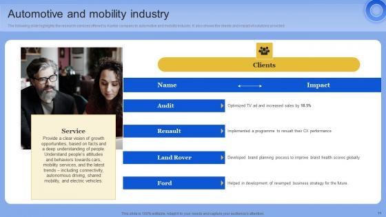 The following slide highlights the research services offered by Kantar company to automotive and mobility industry. It also shows the clients and impact of solutions provided. Find a pre-designed and impeccable Automotive And Mobility Industry Data Analytics Company Outline Introduction PDF The templates can ace your presentation without additional effort. You can download these easy-to-edit presentation templates to make your presentation stand out from others. So, what are you waiting for Download the template from Slidegeeks today and give a unique touch to your presentation. The following slide highlights the research services offered by Kantar company to automotive and mobility industry. It also shows the clients and impact of solutions provided