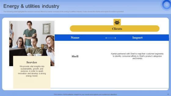 The following slide highlights the research services offered by Kantar company to the energy and utilities industry. It also shows the clients and impact of solutions provided. Slidegeeks is here to make your presentations a breeze with Energy And Utilities Industry Data Analytics Company Outline Slides PDF With our easy-to-use and customizable templates, you can focus on delivering your ideas rather than worrying about formatting. With a variety of designs to choose from, you are sure to find one that suits your needs. And with animations and unique photos, illustrations, and fonts, you can make your presentation pop. So whether you are giving a sales pitch or presenting to the board, make sure to check out Slidegeeks first The following slide highlights the research services offered by Kantar company to the energy and utilities industry. It also shows the clients and impact of solutions provided