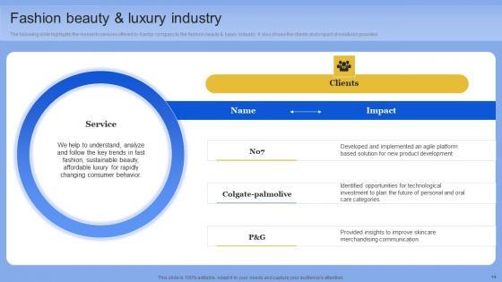 The following slide highlights the research services offered by Kantar company to the fashion beauty and luxury industry. It also shows the clients and impact of solutions provided. Find highly impressive Fashion Beauty And Luxury Industry Data Analytics Company Outline Graphics PDF on Slidegeeks to deliver a meaningful presentation. You can save an ample amount of time using these presentation templates. No need to worry to prepare everything from scratch because Slidegeeks experts have already done a huge research and work for you. You need to download Fashion Beauty And Luxury Industry Data Analytics Company Outline Graphics PDF for your upcoming presentation. All the presentation templates are 100 percent editable and you can change the color and personalize the content accordingly. Download now The following slide highlights the research services offered by Kantar company to the fashion beauty and luxury industry. It also shows the clients and impact of solutions provided