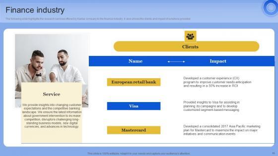 The following slide highlights the research services offered by Kantar company to the finance industry. It also shows the clients and impact of solutions provided. If your project calls for a presentation, then Slidegeeks is your go-to partner because we have professionally designed, easy-to-edit templates that are perfect for any presentation. After downloading, you can easily edit Finance Industry Data Analytics Company Outline Summary PDF and make the changes accordingly. You can rearrange slides or fill them with different images. Check out all the handy templates The following slide highlights the research services offered by Kantar company to the finance industry. It also shows the clients and impact of solutions provided