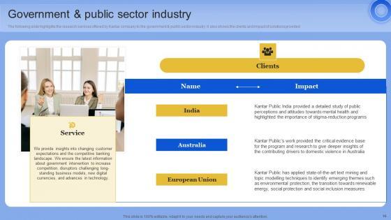 The following slide highlights the research services offered by Kantar company to the government and public sector industry. It also shows the clients and impact of solutions provided. Make sure to capture your audiences attention in your business displays with our gratis customizable Government And Public Sector Industry Data Analytics Company Outline Clipart PDF These are great for business strategies, office conferences, capital raising or task suggestions. If you desire to acquire more customers for your tech business and ensure they stay satisfied, create your own sales presentation with these plain slides. The following slide highlights the research services offered by Kantar company to the government and public sector industry. It also shows the clients and impact of solutions provided