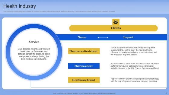 The following slide highlights the research services offered by Kantar company to the health industry. It also shows the clients and impact of solutions provided. Coming up with a presentation necessitates that the majority of the effort goes into the content and the message you intend to convey. The visuals of a PowerPoint presentation can only be effective if it supplements and supports the story that is being told. Keeping this in mind our experts created Health Industry Data Analytics Company Outline Professional PDF to reduce the time that goes into designing the presentation. This way, you can concentrate on the message while our designers take care of providing you with the right template for the situation. The following slide highlights the research services offered by Kantar company to the health industry. It also shows the clients and impact of solutions provided