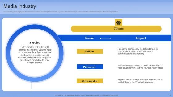 The following slide highlights the research services offered by Kantar company to the media industry. It also shows the clients and impact of solutions provided. The Media Industry Data Analytics Company Outline Structure PDF is a compilation of the most recent design trends as a series of slides. It is suitable for any subject or industry presentation, containing attractive visuals and photo spots for businesses to clearly express their messages. This template contains a variety of slides for the user to input data, such as structures to contrast two elements, bullet points, and slides for written information. Slidegeeks is prepared to create an impression. The following slide highlights the research services offered by Kantar company to the media industry. It also shows the clients and impact of solutions provided