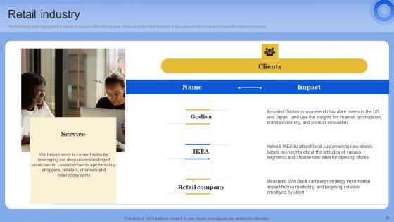 The following slide highlights the research services offered by Kantar company to the retail industry. It also shows the clients and impact of solutions provided Here you can discover an assortment of the finest PowerPoint and Google Slides templates. With these templates, you can create presentations for a variety of purposes while simultaneously providing your audience with an eye-catching visual experience. Download Retail Industry Data Analytics Company Outline Download PDF to deliver an impeccable presentation. These templates will make your job of preparing presentations much quicker, yet still, maintain a high level of quality. Slidegeeks has experienced researchers who prepare these templates and write high-quality content for you. Later on, you can personalize the content by editing the Retail Industry Data Analytics Company Outline Download PDF The following slide highlights the research services offered by Kantar company to the retail industry. It also shows the clients and impact of solutions provided