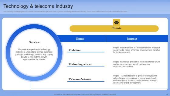 The following slide highlights the research services offered by Kantar company to the technology and telecoms industry. It also shows the clients and impact of solutions provided. Do you know about Slidesgeeks Technology And Telecoms Industry Data Analytics Company Outline Rules PDF These are perfect for delivering any kind od presentation. Using it, create PowerPoint presentations that communicate your ideas and engage audiences. Save time and effort by using our pre-designed presentation templates that are perfect for a wide range of topic. Our vast selection of designs covers a range of styles, from creative to business, and are all highly customizable and easy to edit. Download as a PowerPoint template or use them as Google Slides themes. The following slide highlights the research services offered by Kantar company to the technology and telecoms industry. It also shows the clients and impact of solutions provided