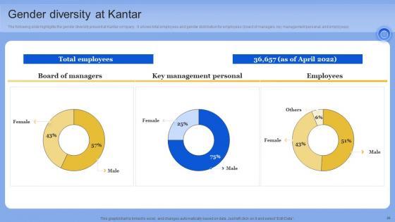 The following slide highlights the gender diversity present at Kantar company. It shows total employees and gender distribution for employees board of managers, key management personal, and employees. If you are looking for a format to display your unique thoughts, then the professionally designed Gender Diversity At Kantar Data Analytics Company Outline Portrait PDF is the one for you. You can use it as a Google Slides template or a PowerPoint template. Incorporate impressive visuals, symbols, images, and other charts. Modify or reorganize the text boxes as you desire. Experiment with shade schemes and font pairings. Alter, share or cooperate with other people on your work. Download Gender Diversity At Kantar Data Analytics Company Outline Portrait PDF and find out how to give a successful presentation. Present a perfect display to your team and make your presentation unforgettable. The following slide highlights the gender diversity present at Kantar company. It shows total employees and gender distribution for employees board of managers, key management personal, and employees