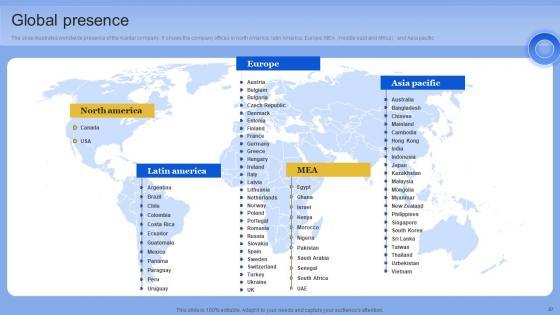 The slide illustrates worldwide presence of the Kantar company. It shows the company offices in north America, latin America, Europe, MEA middle east and Africa, and Asia pacific. Crafting an eye-catching presentation has never been more straightforward. Let your presentation shine with this tasteful yet straightforward Global Presence Data Analytics Company Outline Themes PDF template. It offers a minimalistic and classy look that is great for making a statement. The colors have been employed intelligently to add a bit of playfulness while still remaining professional. Construct the ideal Global Presence Data Analytics Company Outline Themes PDF that effortlessly grabs the attention of your audience Begin now and be certain to wow your customers The slide illustrates worldwide presence of the Kantar company. It shows the company offices in north America, latin America, Europe, MEA middle east and Africa, and Asia pacific